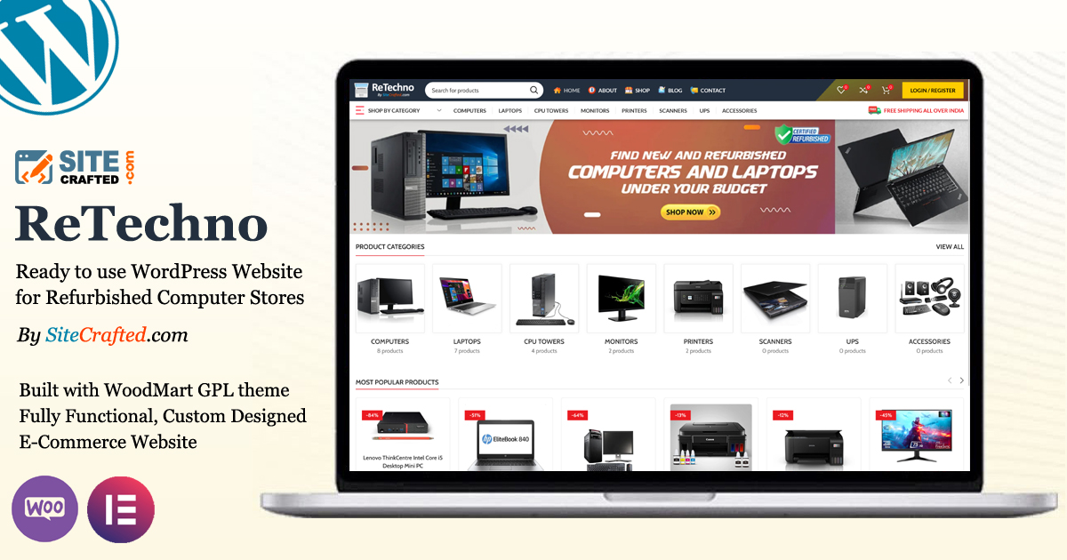 ReTechno, developed by SiteCrafted Web Solutions, is a premium refurbished computers ecommerce WordPress website crafted for businesses selling refurbished laptops, used desktops, renewed monitors, second-hand PCs, computer accessories, and certified refurbished electronics. Whether you operate a refurbished laptop store, renewed electronics shop, or a PC repair & resell business, ReTechno provides the perfect ready-to-launch platform.